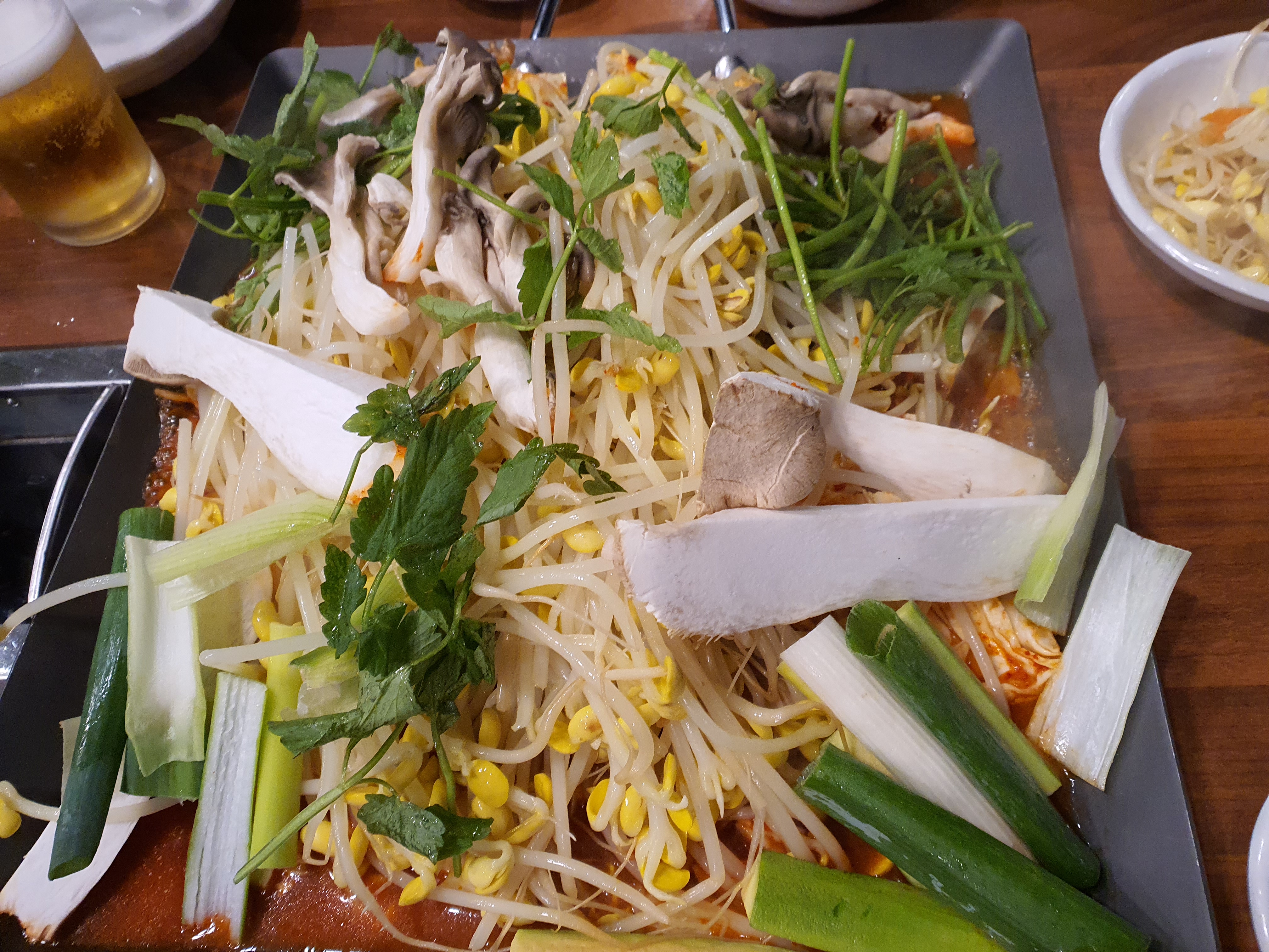 밑반찬에 맥주 한 잔 하는동안 주문한 산낙지 철판이 나왔습니다.