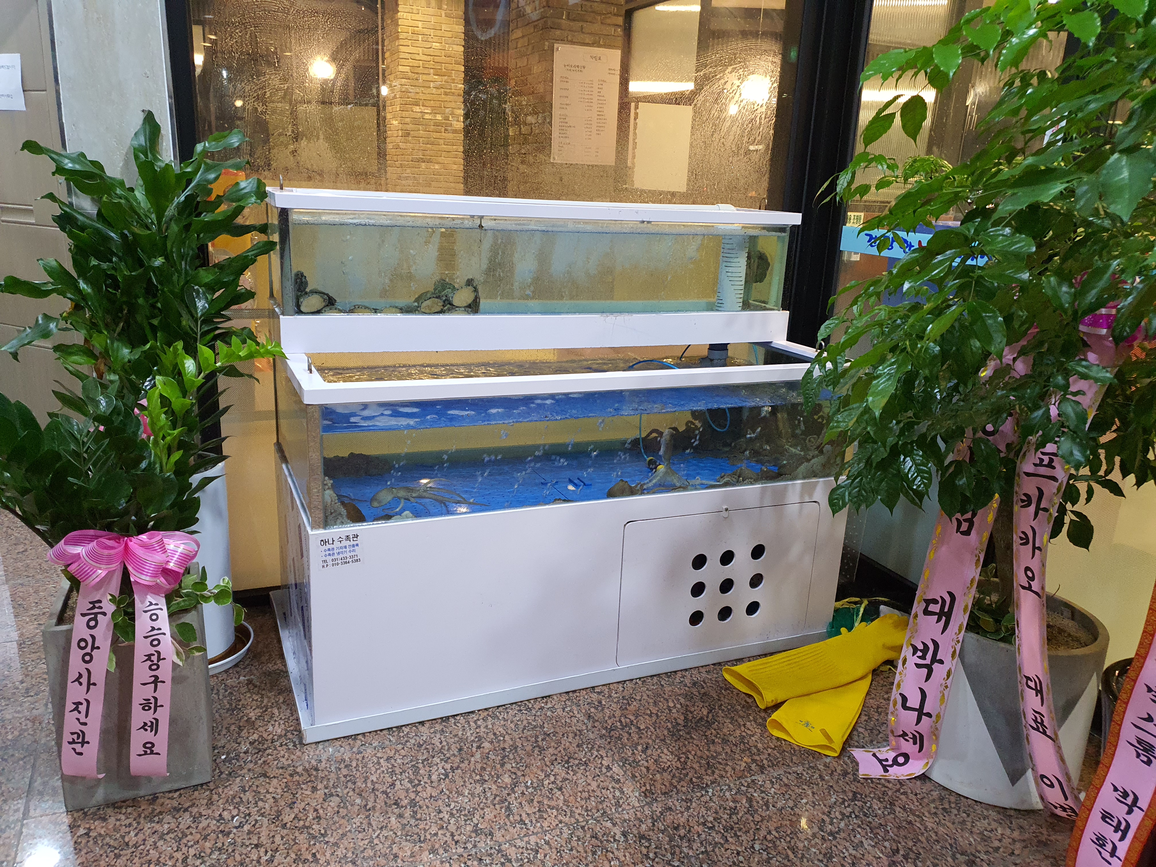 음식점 입구에 수족관이 있습니다.