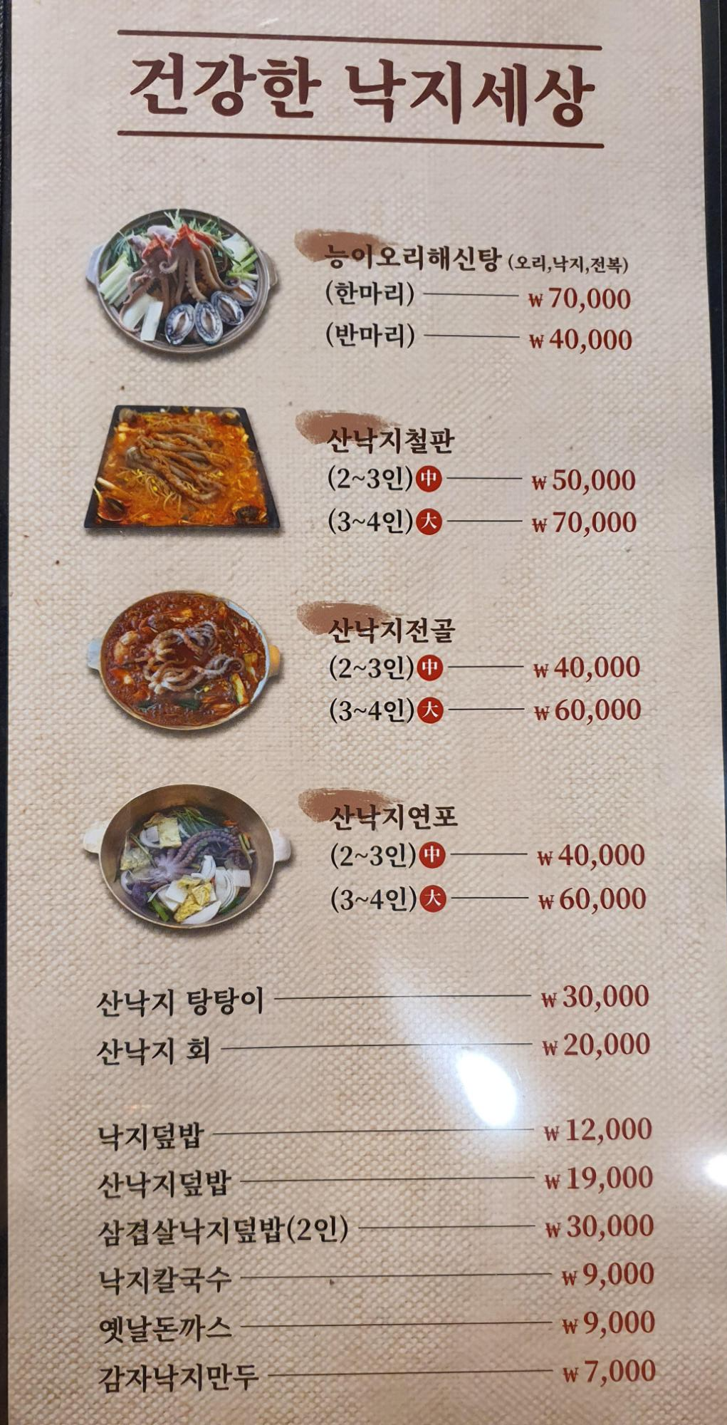 아래 건강한 낙지세상 메뉴판 입니다.