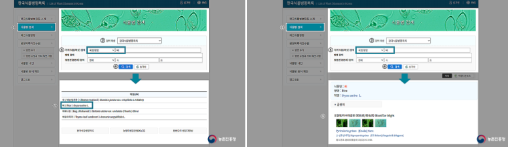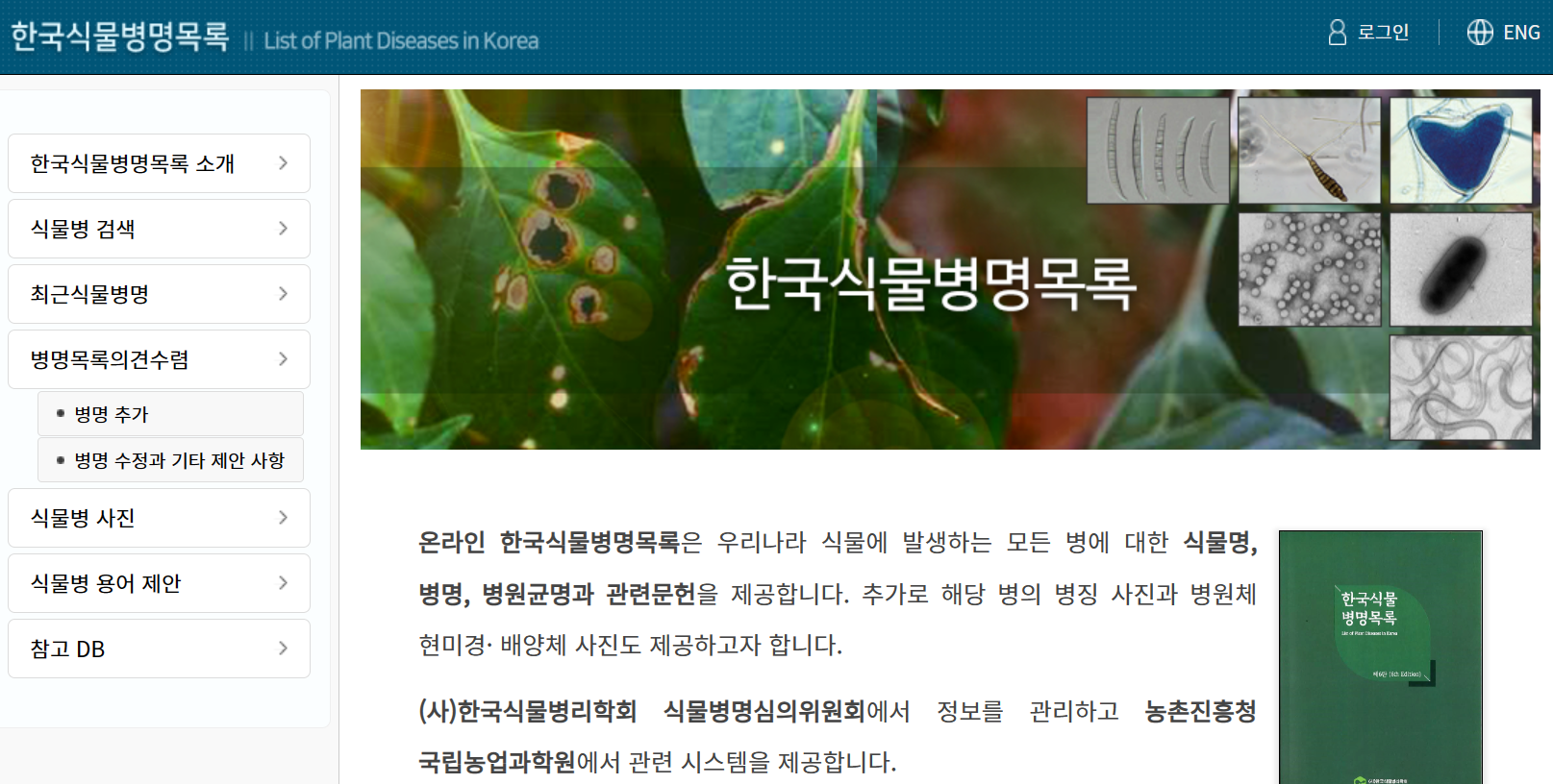 우리나라에 서식하는 식물에 발생하는 모든 벼의 이름과 병원균은 물론, 관련 문헌을 데이터베이스화 해 제공하고 있습니다.