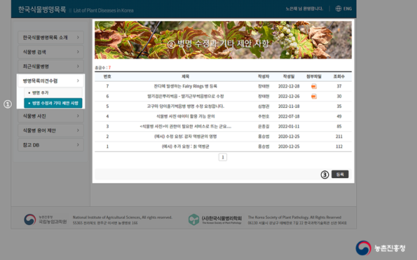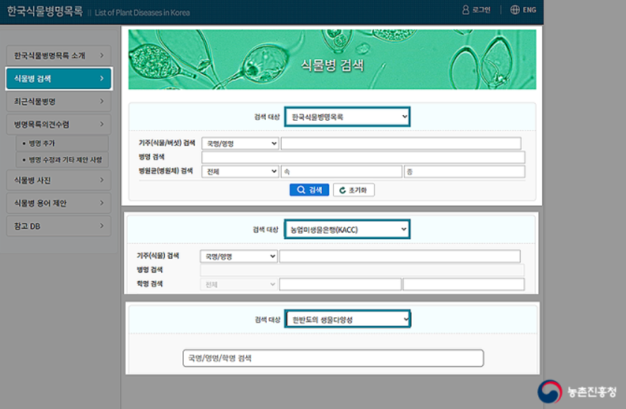 한국식물병명목록 누리집을 만들기 위해 참고한 데이터베이스(DB)는 정말 많은데, 그중 유용한 국내 누리집 3곳이 있습니다.