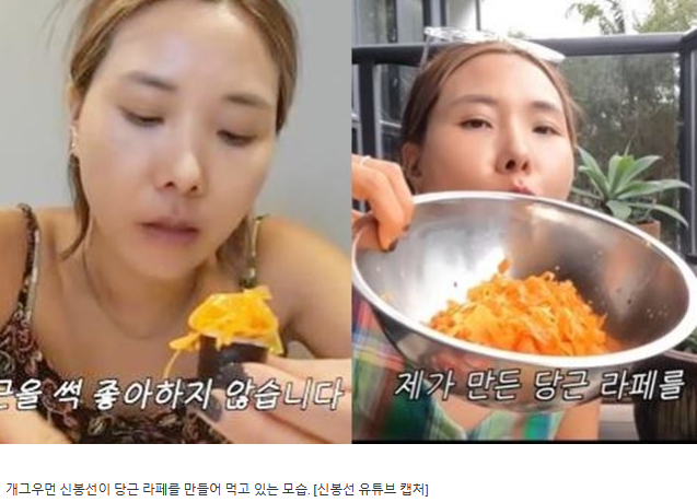 지난 1월 25일 신봉선의 유튜브 채널 'ㄴ신봉선ㄱ'에는 '호주 가서 3주 내내 먹은 환장 레시피 대 공개' 당근라페 활용법'이라는 제목의 영상이 올라왔다고 합니다.