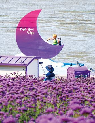 퍼플섬에는 계절에 따라 라벤더, 버들마편초,아스타 등 다양한 품종의 보라색 꽃들이 식재되고 있어 해안도로와 언덕 곳곳이 인증 사진을 남길 수 있는 포토존으로 변모합니다. 특히 반월도 카페 주변 천사공원에 식재된 꽃들은 카페 건물의 보라색 지붕, 어린 왕자 조형물, 드넓은 갯벌과 조화를 이루어 가을이 오는 퍼플섬을 더욱 수려한 모습으로 치장해 줍니다.