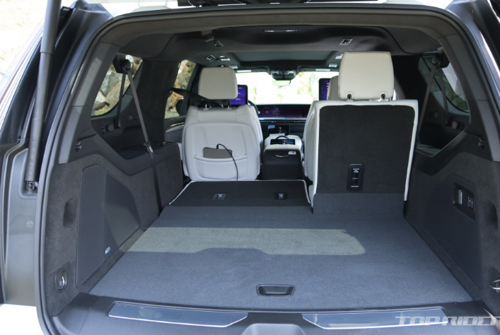 접이식 테이블은 좌우 하나씩 제공됩니다. 15인치 노트북을 올려두고 사용할 수 있을 정도로 사이즈가 넉넉합니다. 신형 에스컬레이드 ESV는 1열과 2열, 3열 공간이 모두 여유롭습니다. 특히 3열 레그룸은 다른 3열 SUV와 비교 불가합니다. 3열에도 컵홀더 등이 배치됐습니다.