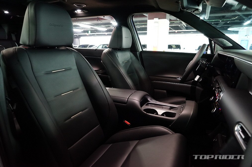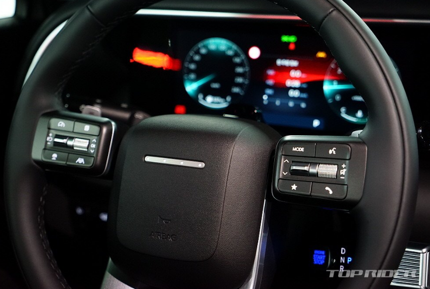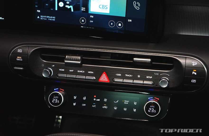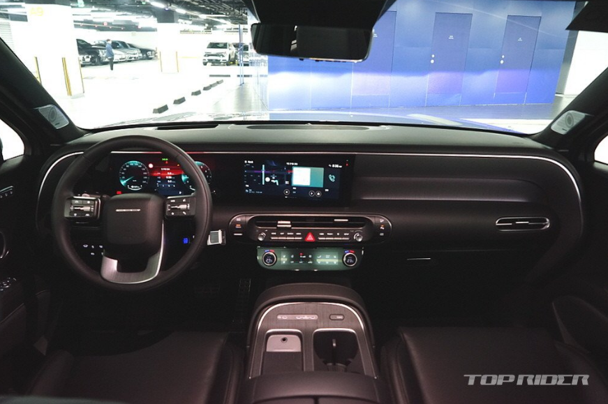 실내는 수평형 레이아웃을 통해 안정감을 강조합니다. 디스플레이 상단부 패널을 하나로 이어, 최근 출시된 대부분의 현대차그룹 신차와 차별화했습니다. 이것만으로도 만족스럽습니다. 센터터널은 9인승을 함께 고려한 디자인입니다. 에어벤트 주변 가죽처럼 보이는 마감재는 고급감이 남다릅니다.