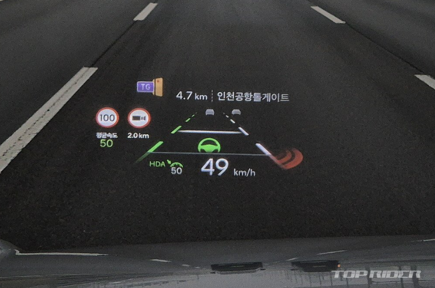 고속도로주행보조 동작시 헤드업 디스플레이에는 점선과 실선을 구분해 보여줍니다. 차로내 주행을 유도하는 모습이나 램프를 돌아나가는 모습은 EV9의 개선된 ADAS 시스템과 유사한 모습입니다. 정체 구간 주행 시 전방 차량과의 차간 거리를 예전보다 좁게 설정해 끼어들기를 방지합니다.