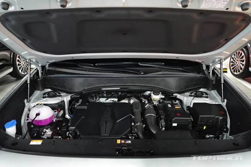 팰리세이드 2.5T에는 2.5리터 4기통 스마트스트림 가솔린 터보엔진과 8단 자동변속기, AWD 사륜구동 조합으로 최고출력 281마력(5900rpm), 최대토크 43.0kgm(1700~4000rpm)입니다. 공차중량 2140kg, 국내 복합연비 8.2km/ℓ(도심 7.2, 고속 9.8), 2WD는 8.7km/ℓ(도심 7.6, 고속 10.6)이라고 합니다.