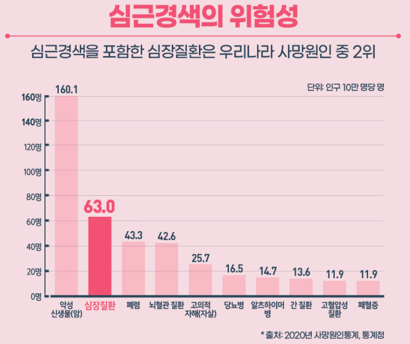 심근경색과 뇌졸중은 주요한 사망원인으로 증상이 갑자기 나타나느 것이 특징이나, 조기에 발견하여 치료하면 사망과 장애를 막을 수 있다고 합니다.