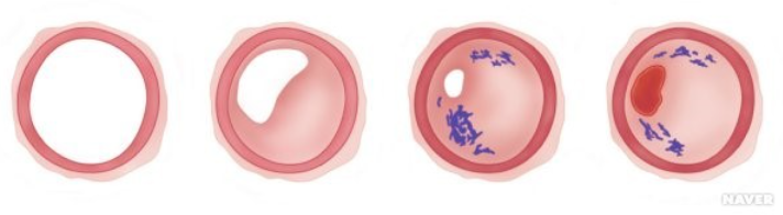 문제는 혈관이 갑자기 막힌다는 것인데, 혈관 내 기름기가 쌓여 단단해진 섬유성 막인 '죽상경화반'이 파열되고, 파열된 죽상경화반에 적혈구, 혈소판 등이 달라붙어 생긴 혈전이라는 혈액 찌꺼기가 관상동맥을 완전히 막아버린다고 합니다.