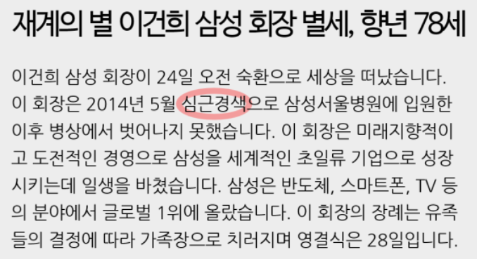 아마 심근경색은 삼성 이건희 회장의 사망소식과 함께 더 많은 관심을 갖는 질병이 아닐까 싶습니다.