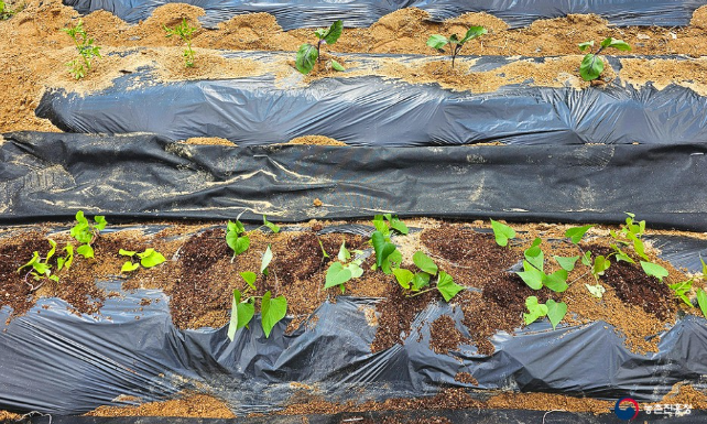 본격적으로 심기 전, 일정한 간격을 두고 심을 위치를 잡아줍니다. 25~30cm가 적당합니다. 굵은 고구마를 원하는 분은 간격을 넓혀 심으면 됩니다.