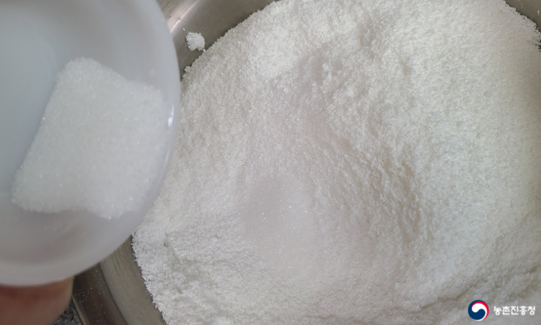 3. 커다란 볼에 멥쌀가루를 넣고 소금과 설탕을 넣어 줍니다.