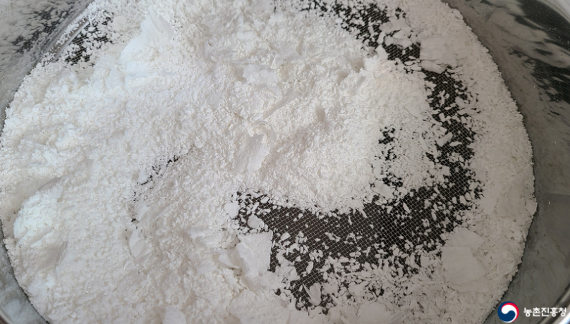 4. 섞은 멥쌀가루는 체에 곱게 내려줍니다. 체에 내리면 공기가 들어가서 식감이 더 맛있어집니다.