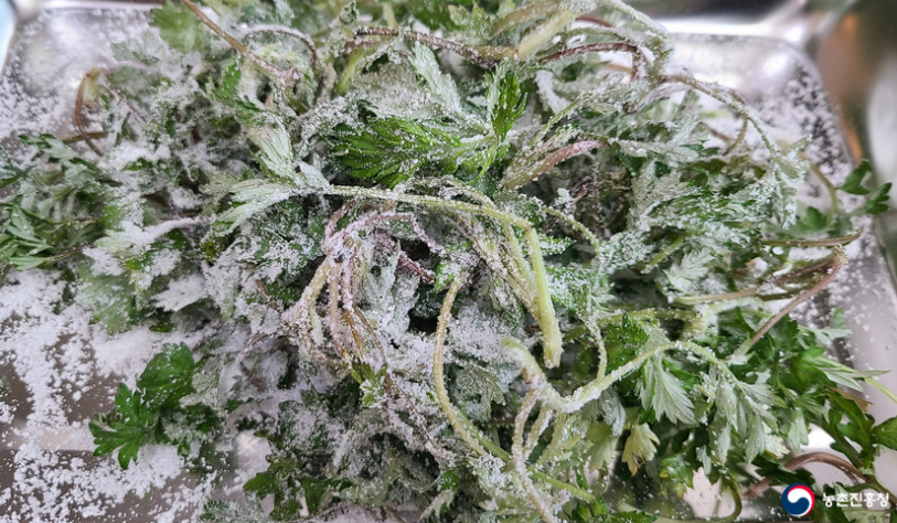 1. 쑥은 줄기의 억센 부분이나 누렇게 뜬 잎, 상태가 안 좋은 잎은 제거하여 손질합니다.