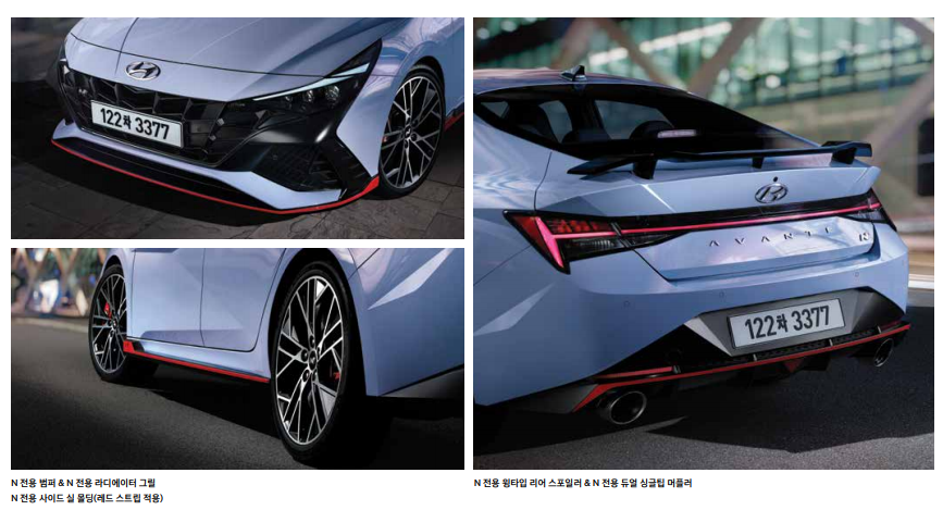 아반떼 N의 전면부는 기본차 대비 블랙트림부를 확대하고 범퍼 하단부를 낮게 가로지르는 립 스포일러가 고성능의 안정적인 스탠스를 구현해준다고 합니다.