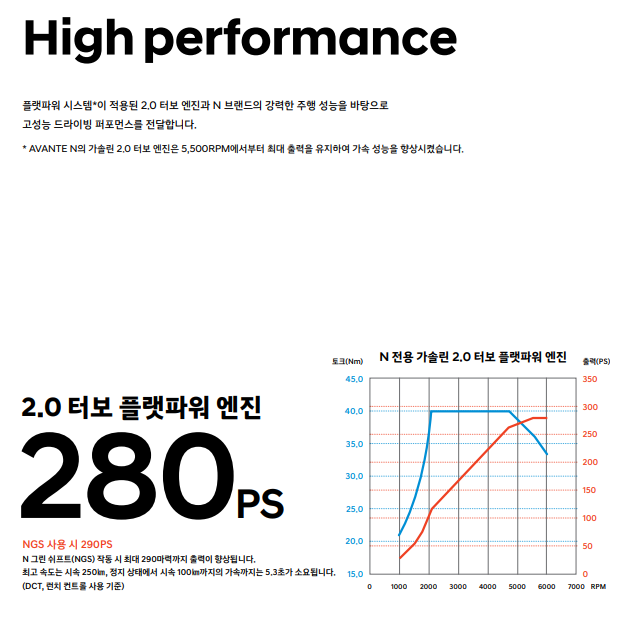 아반떼 N은 플랫파워 엔진에 8단 습식 듀얼 클러치 변속기(DCT)가 적용돼 초고출력 280마력(ps), 최대토크 40kgf·m를 내며 N 그린 쉬프트(NGS)를 작동할 경우 터보 부스트압을 높여줘 최대 290마력까지 출력을 일시적으로 높여준다고 합니다.