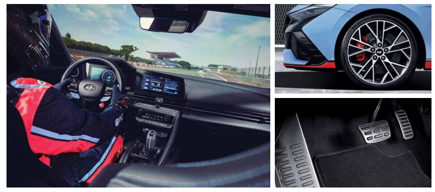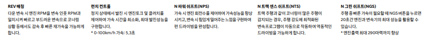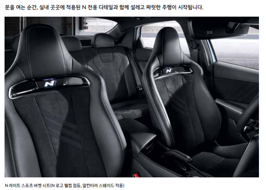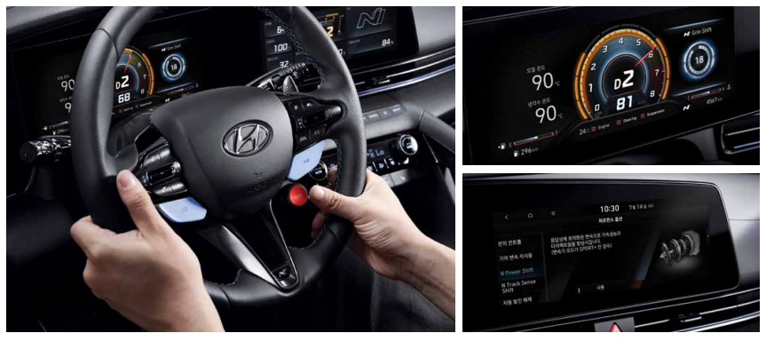패들 쉬프터가 적용된 스티어링 휠에는 최대 20초 동안 10마력의 출력을 끌어올리는 NGS 버튼(DCT 전용)과 함께 운전 스타일 별로 원하는 드라이브 모드를 각각 설정할 수 있는 2개의 N 버튼을 배치함으로써 어떠한 주행환경에서도 최적의 셋업을 간편하게선택할 수 있도록 했다고 합니다.