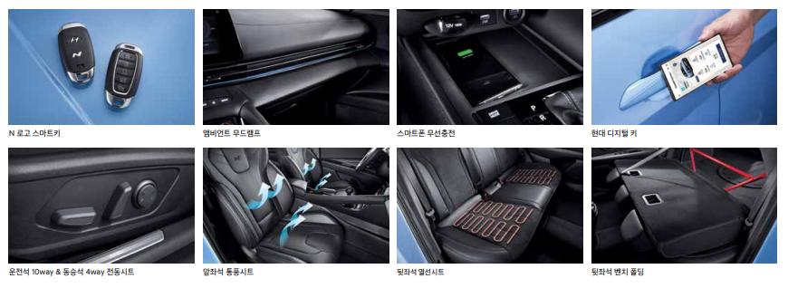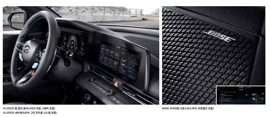 운전의 즐거움을 제공하기 위한 특별한 기능도 추가됐는데, N 사운드 이퀼라이저(NSE)는 한 차원 진화한 가상 엔진 사운드로 TCR 경주차 사운드 등 현대차 모터스포츠를 대표하는 주행 사운드를 제공할 뿐 아니라, 개인 취향을 고려해 화인, 럼블, 엔진 메인 세 가지 음역 별 세부사항 조정이 가능한 이퀼라이저 기능도 함께 탑재했다고 합니다.