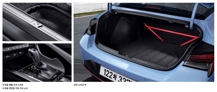 후면부에서 가장 눈에 띄는 N 전용 윙타입 스포일러는 사이드스커트, 리어 디퓨저와 함께 주행 시 부딪히는 공기를 정돈해주어 최적의 공력성능을 구현함과 동시에 고성능차의 차별화된 캐릭터를 더욱 부각시켜준다고 합니다.
