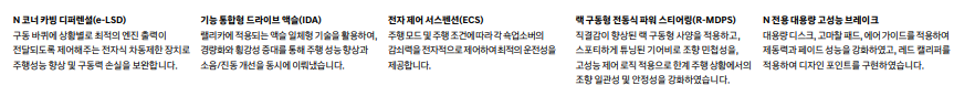 이 외에도 바디 강성 가와를 위해 기존구조 대비 1점이 추가된 4점식 스트럿링 및 노출형 리어 스티프바를 적용했고, 토크 피드백랙 구동형 전동식 파워스티어링(R-MDPS)을 적용해 운전자 조향감을 제공해준다고 합니다.