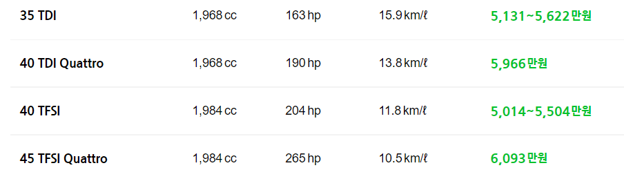 A4 가솔린은 LED 헤드램프, 하이빔 어시스트, 3-ZONE 공조기, 12.3인치 디지털 계기판, MMi 내비게이션 플러스, 전방 충돌 경고 및 제동, 사이드 어시스트 등을 기본으로 프리미엄에는 1열 통풍 시트, HUD, 어댑티브 크루즈 컨트롤, 차선 유지 보조 시스템 등이 추가된다고 합니다.