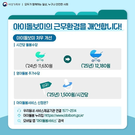 - 시간당 돌봄수당 : ('24년) 11,630원 → ('25년) 12,180원