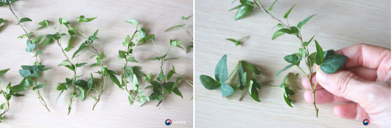 기다란 가지를 중심으로 잎이 달려있는 줄기는 메인 가지가 상하지 않도록, 끝만 잡아 똑똑 따줍니다.