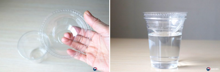 컵뚜껑 윗면에 있는 지름 2cm가량의 구멍이 아래로 가도록 뒤집어 컵 위에 올려둔 상태에서 물을 컵뚜껑과 닿지 않을 정도로 부어줍니다.