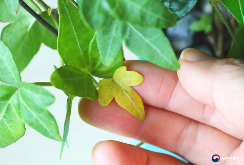 잎이 오래되면 노랗게 변하는 경향이 있습니다. 이때 너무 건조하면 갈변됩니다. 건조하게 관리하는 것도 좋지만, 긴 시간 유지되면 낙엽이 지기 마련이니 물 관리에 신경 써주어야 합니다.