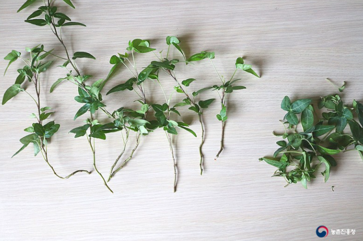 기다란 가지를 중심으로 잎이 달려있는 줄기는 메인 가지가 상하지 않도록, 끝만 잡아 똑똑 따줍니다.