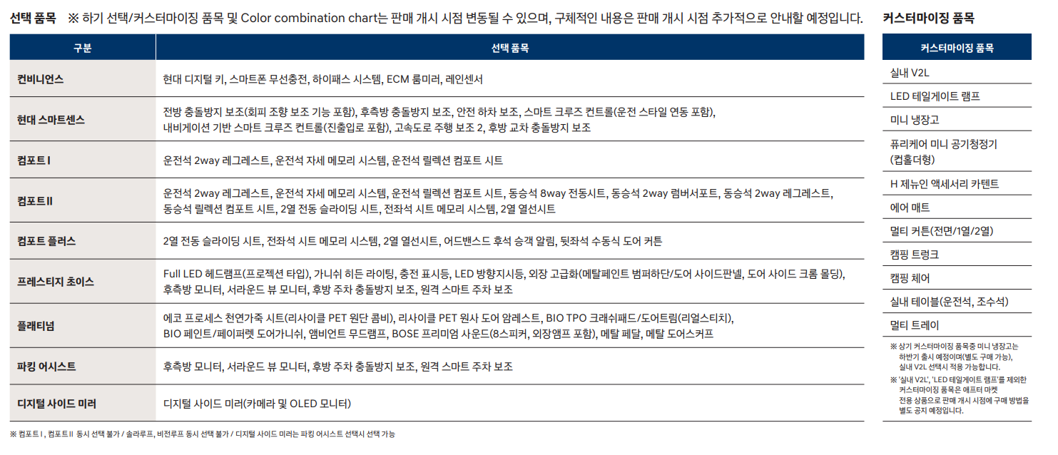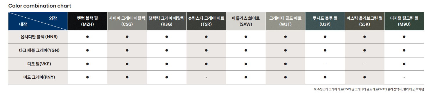 외장 : 팬텀 블랙 펄 (MZH) 사이버 그레이 메탈릭 (C5G) 갤럭틱 그레이 메탈릭 (R3G) 슈팅스타 그레이 매트 (T5R) 아틀라스 화이트 (SAW) 그래비티 골드 매트 (W3T) 루시드 블루 펄 (U3P) 미스틱 올리브그린 펄 (S5K) 디지털 틸그린 펄 (M9U)
