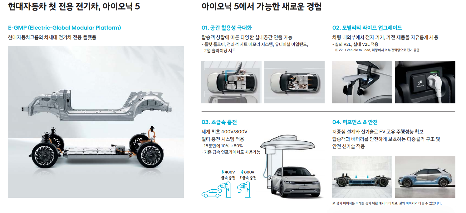 아이오닉 5는 현대차의 전기차 전용 플랫폼 E-GMP를 처음으로 적용한 야심작이라고 합니다.