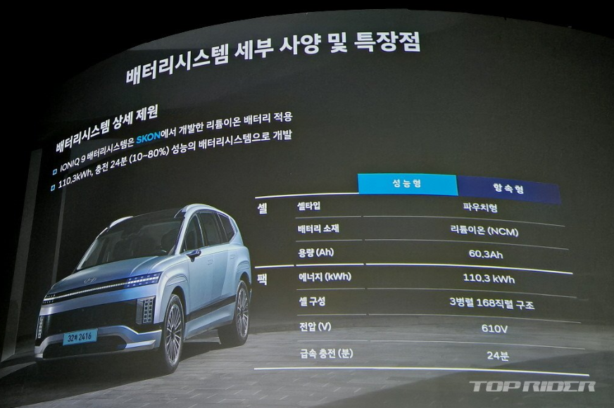 아이오닉9에는 110.3kWh 리튬이온 배터리팩이 기본으로 적용됩니다. 싱글 전기모터는 후륜구동으로 공차중량 251kg, 최고출력 160kW(218마력), 최대토크 35.7kgm, 복합 주행거리 532km, 시승차는 성능형 4WD로 2675kg, 315kW(428마력), 71.4kgm, 복합 501km(도심 544, 고속 449)입니다.