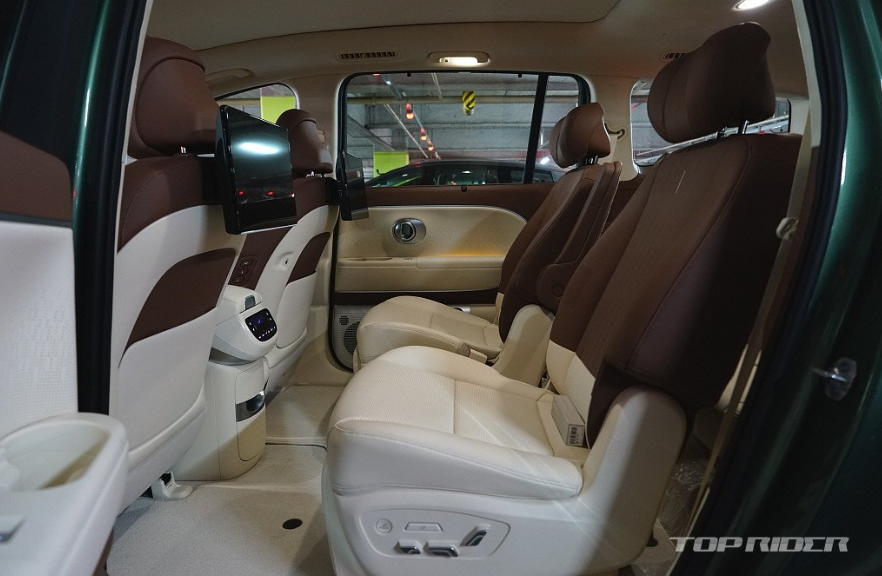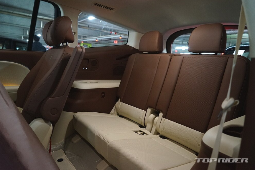 실내는 수평형 대시보드와 커브드 디스플레이를 통해 개방감이 강조됐다고 합니다. 전체적으로 동글동글한 디자인을 통해 아늑한 느낌을 전합니다. 앰비언트 라이트가 적용된 부분에서 소재감을 살린 점은 EV9 대비 앞서는 부분입니다. 3열 공간의 헤드룸을 비롯한 거주성은 신형 팰리세이드를 앞섭니다.