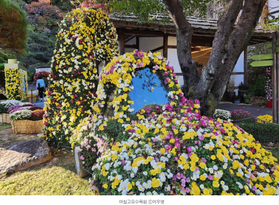 아침고요수목원 입장하자만다 오른쪽에 있는 고형집정원에는 가을을 대표하는 국화가 피었고, 국화 토피어리와 국화포토존, 국화자동차 등 조형물도 있습니다.
