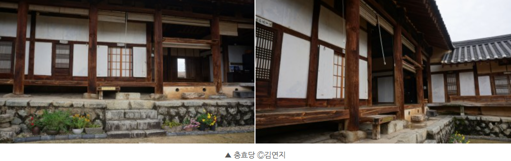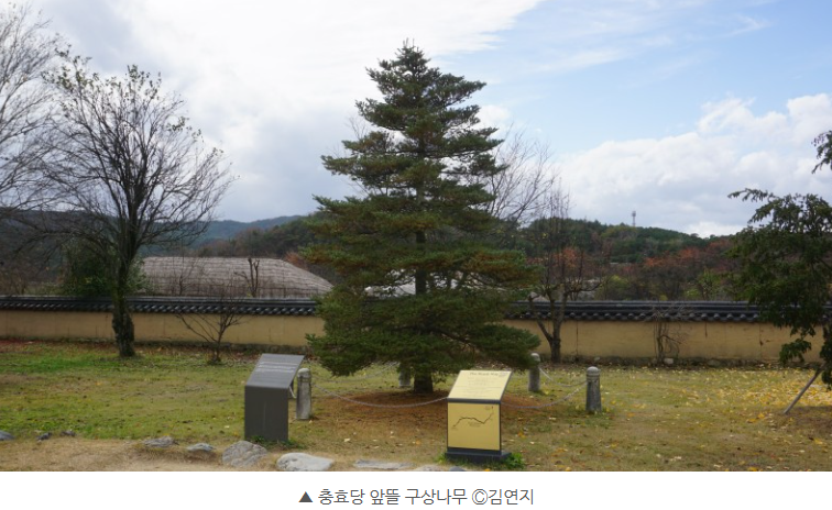 충효당 앞뜰에는 엘리자베스 2세 영국 여왕이 안동 하회마을을 방문한 것을 기념하기 위해 심은 구상 나무를 볼 수 있습니다. 구상나무는 한국 고유의 나무로, 추위를 잘 견디는 굳건함과 우아함을 나타냅니다.