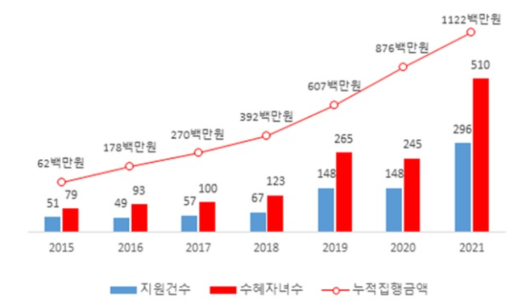 자난 2015년 도입 첫해 약 6000만 원을 지원했으며, 지난해까지 7년간 총 1415명의 미성년 자녀에게 약 11억 2000만 원을 지급했다고 합니다.