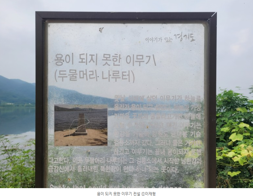 두물머리 나루터에 용이 되지 못한 아무기가 살았다고 합니다. 옛날 서해에 살던 아무기가 하늘로 올라가 용이 되고 싶었다고 합니다. 하늘과 가장 가까운 곳까지 물을 타고 가면 하늘에 오를 것으로 여긴 이무기는 한강을 거슬러 올라가 강원도 금대봉 기슭 검룡소까지 갔다고 합니다. 그러나 물은 거기서 끊겼고, 이무기는 끝내 용이 되지 못했습니다. 두물머리 나루터는 그 검룡소에서 시작한 남한강과 금강산에 흘러내린 북한강이 만나 하나 되는 곳이라고 합니다.