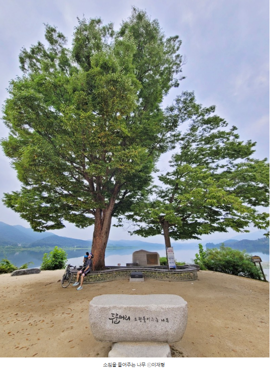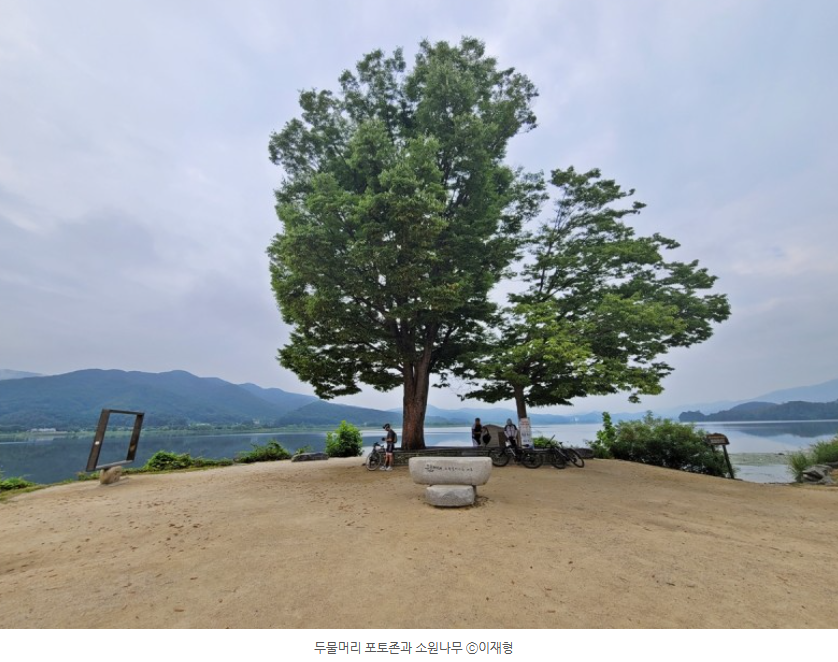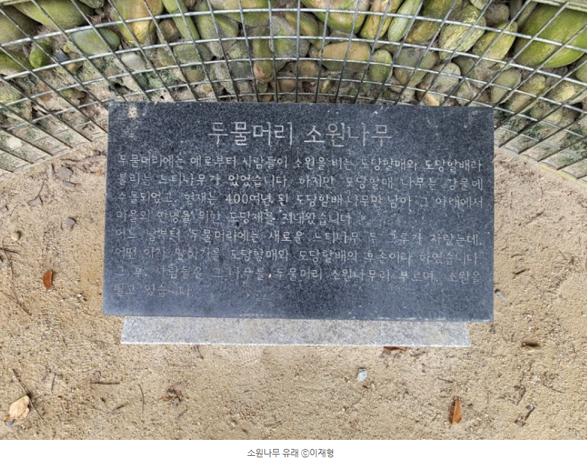 소원나무 아래 유래를 설명해주는 판이 있습니다. 두물머리에는 예로부터 사람들이 소원을 비는 도당 할매와 도당 할배라 부리는 느티나무가 있었습니다. 하지만 도당 할매 나무는 강물에 수몰되었고, 현재는 400여 년 된 도당 할배 나무만 남아 그 아래에서 마을의 안녕을 위한 도당제를 지낸다고 합니다.