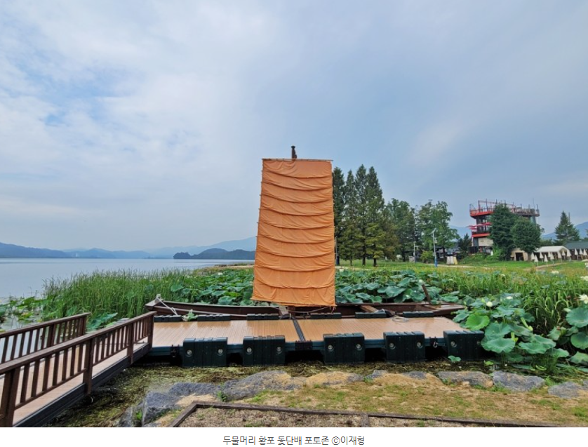 보호수 오른쪽에 황포 돛단배 포토존이 있습니다. 예전에는 돛단배가 두물머리를 많이 다녔겠지만, 지금은 이렇게 포토존으로만 남아 있다고 합니다. 돛단배 주변에는 연꽃이 아직도 남아 있습니다.
