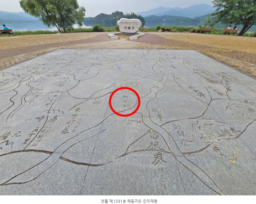 두물경 앞바다에는 해동지도(보물 제1591호) 중 경기도 광주시 일부가 그려져 있습니다. 해동지도는 1750년경 조선 시대에 제작된 것으로 추정되는 회화식 지도책으로 본 지도는 경기도 광주부 지도 일부를 옮겨놓은 것이라고 합니다.