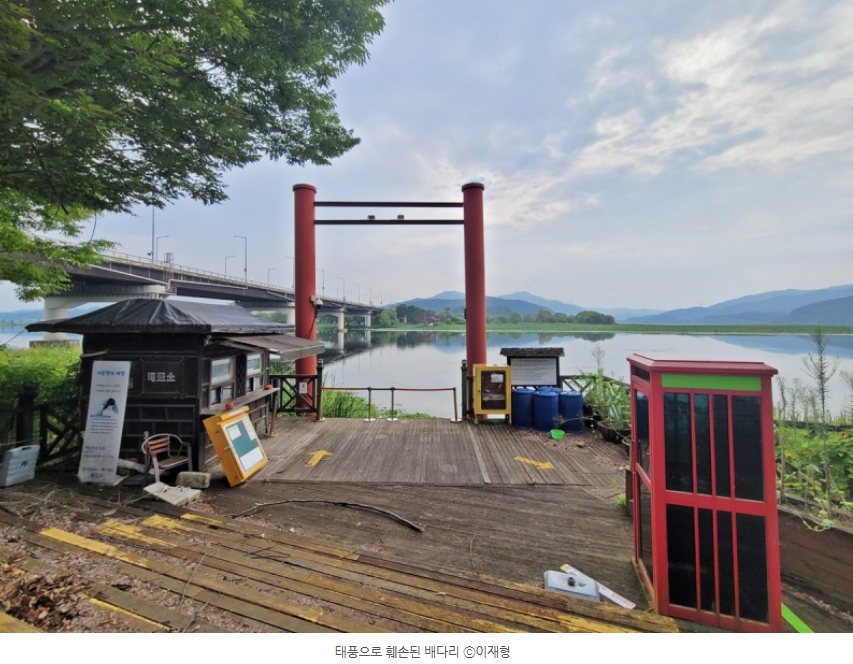 두물머리 탐방로에서 세미원으로 건너갈 수 있는 배다리가 있는데, 태풍으로 훼손돼 현재 공사 중이라고 합니다. 배다리는 여러 척의 배를 가로로 포개어놓고 그 위에 나무판을 얹어서 만든 다리라고 합니다. 빨리 공사가 끝나서 명물 배다리가 많은 사람에게 사랑받는 명소가 되길 바라봅니다.