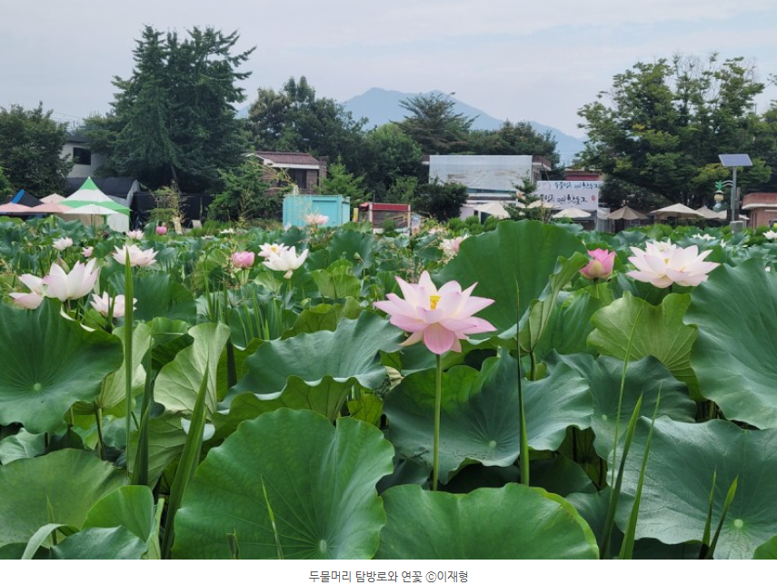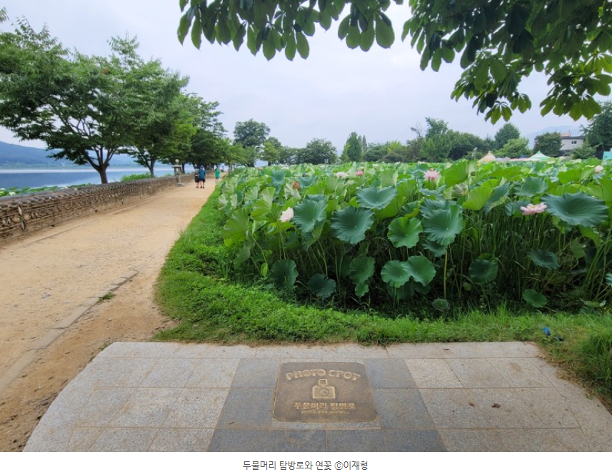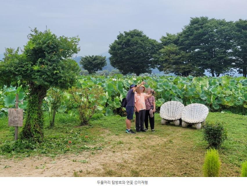 대형 연꽃이 피어 있는 두물머리 탐방로