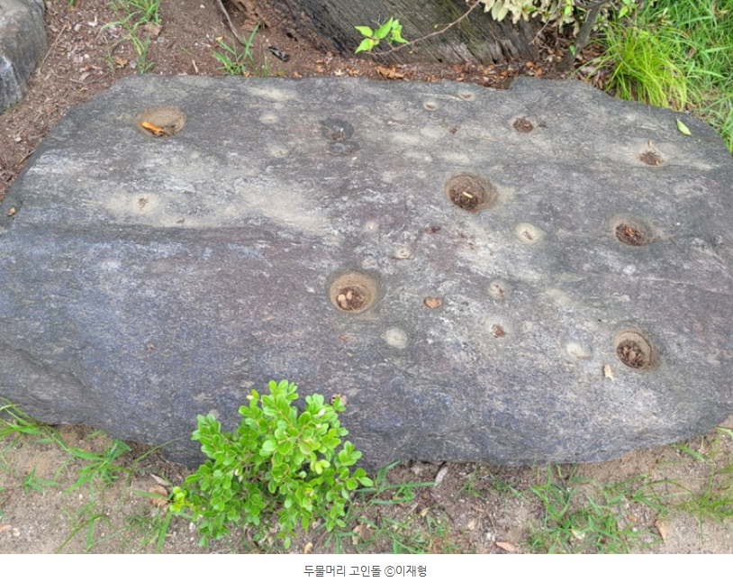 보호수 뒤에 두물머리 고인돌이 있습니다. 1974년 문화재 관리국에서 발굴 조사하여 팔당댐 수몰지구 유적발굴 종합보고서에 수록된 고인돌로 우리나라 청동기시대에 조성된 것으로 알려져 있다고 합니다. 덮개돌 위에 바위 구멍이 관찰되는데 지금 20cm 정도 되는 구멍은 해석이 다양하지만, 북두칠성을 의미하는 성혈이라는 견해가 유력하다고 합니다.
