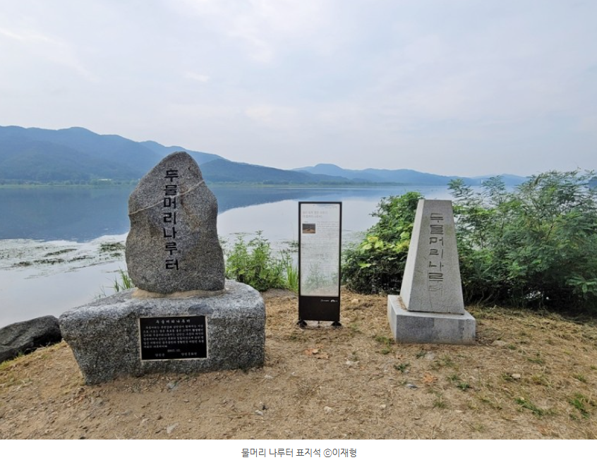두물경입니다. 화강암 표지석에 '남한강 북한강 하나 된 두물머리, 겨레의 기적이 숨 쉬는 우리의 한강'이라는 글귀가 적혀있습니다. 많은 사람이 이곳에서 사진을 찍기 위해 기다려서 찍어햐 했습니다. 앞에 소개해 드린 액자 포토존과 함께 두물머리의 새로운 포토존으로 인기가 많다고 합니다.