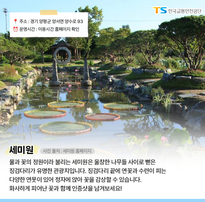 물과 꽃의 정원일 불리는 세미원은 울창한 나무들 사이로 뻗은 징검다리가 유명한 관광지입니다.