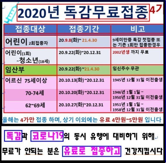 9월 8일부터 실시되는 독감 무료접종 안내입니다.