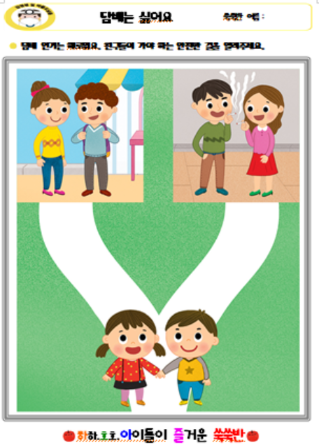 ʻ담배는 싫어요ʼ 활동지를 보며 담배 피우는 어른을 만났을 때 안전하게 가는 길을 찾아본다.