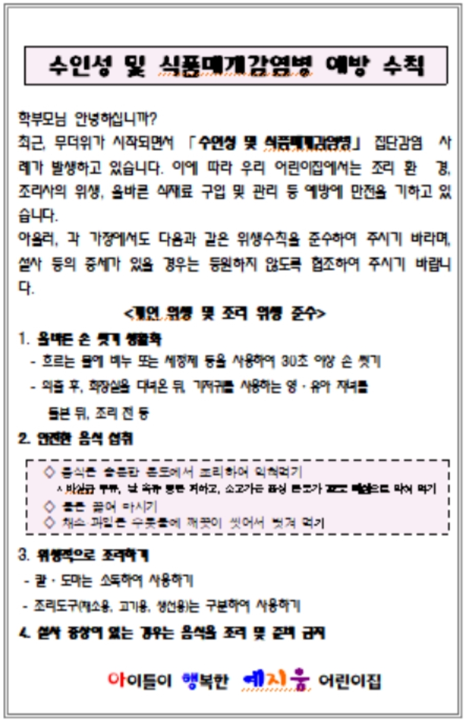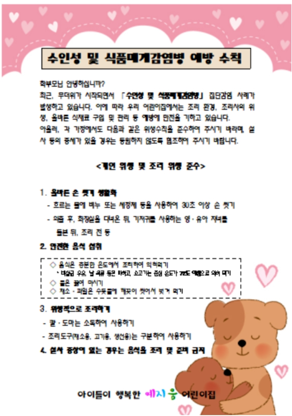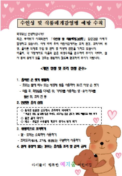 요즘 안산 햄버거병을 비롯해 어린이집에 식품예방수칙 안내문이 나가는 걸로 알고 있습니다.