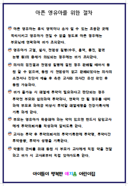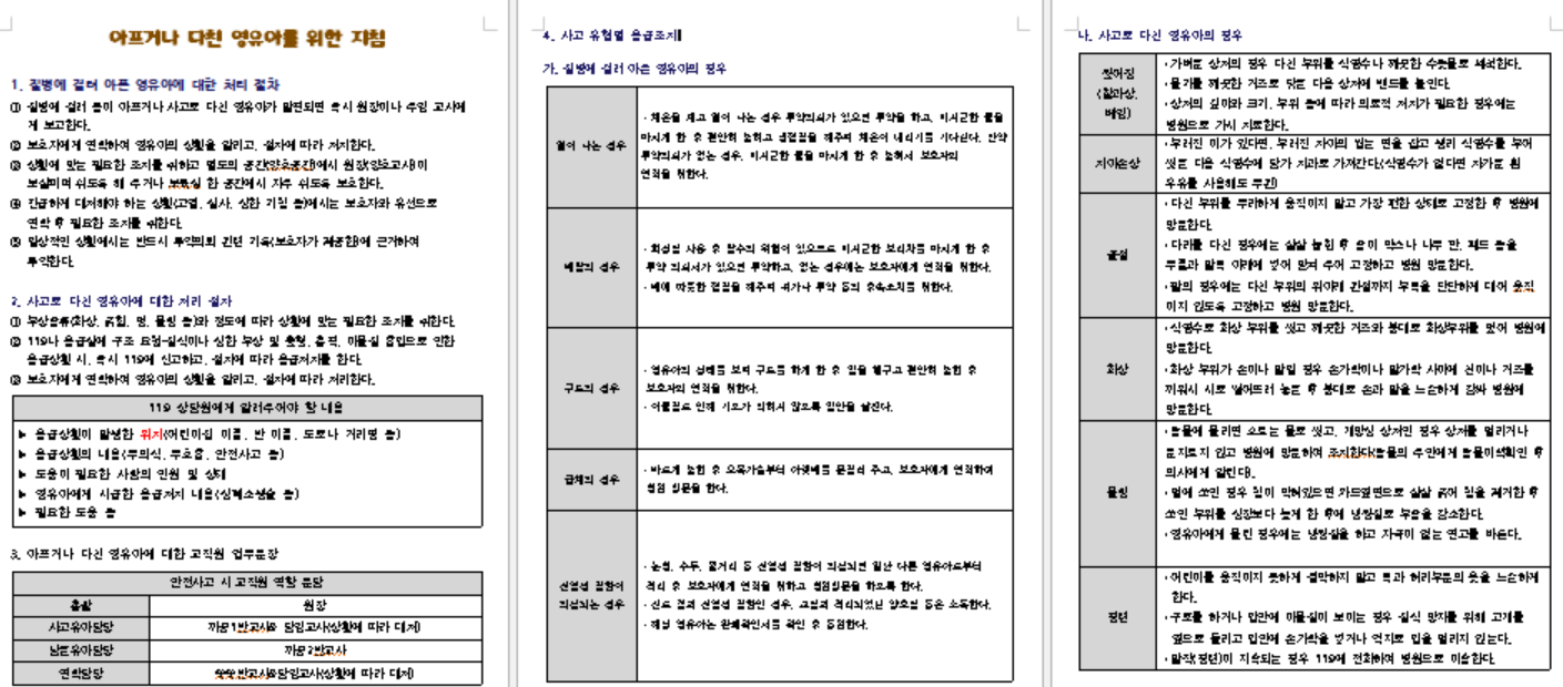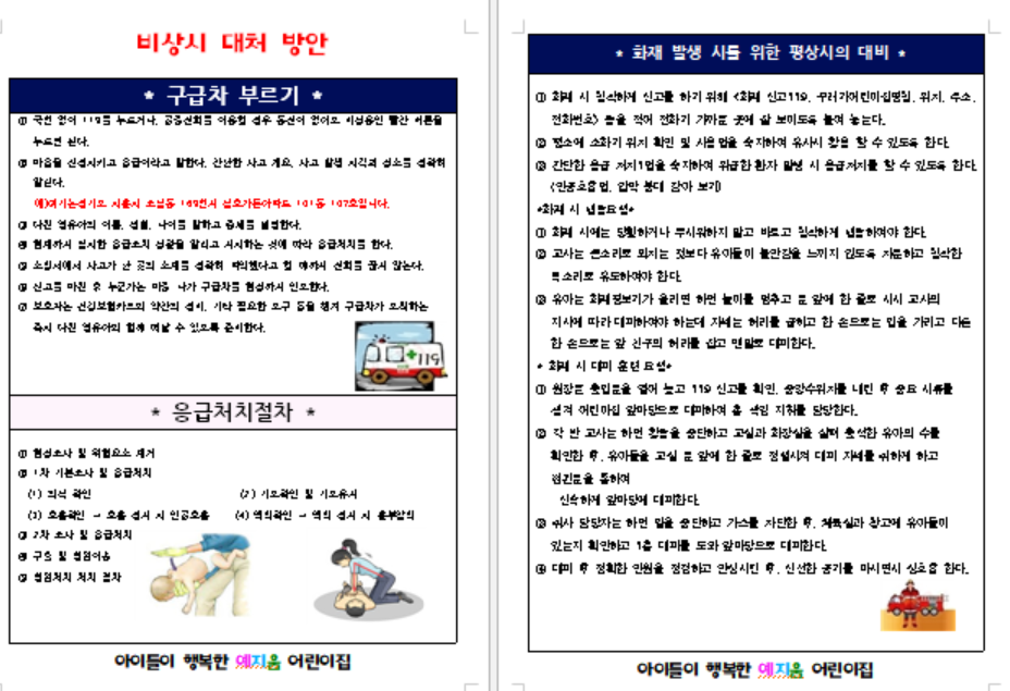 오늘은 어린이집 서류중 중요한 서류인 어린이집 응급시 대처방안에 관련하여 모두 올려보려고 합니다.